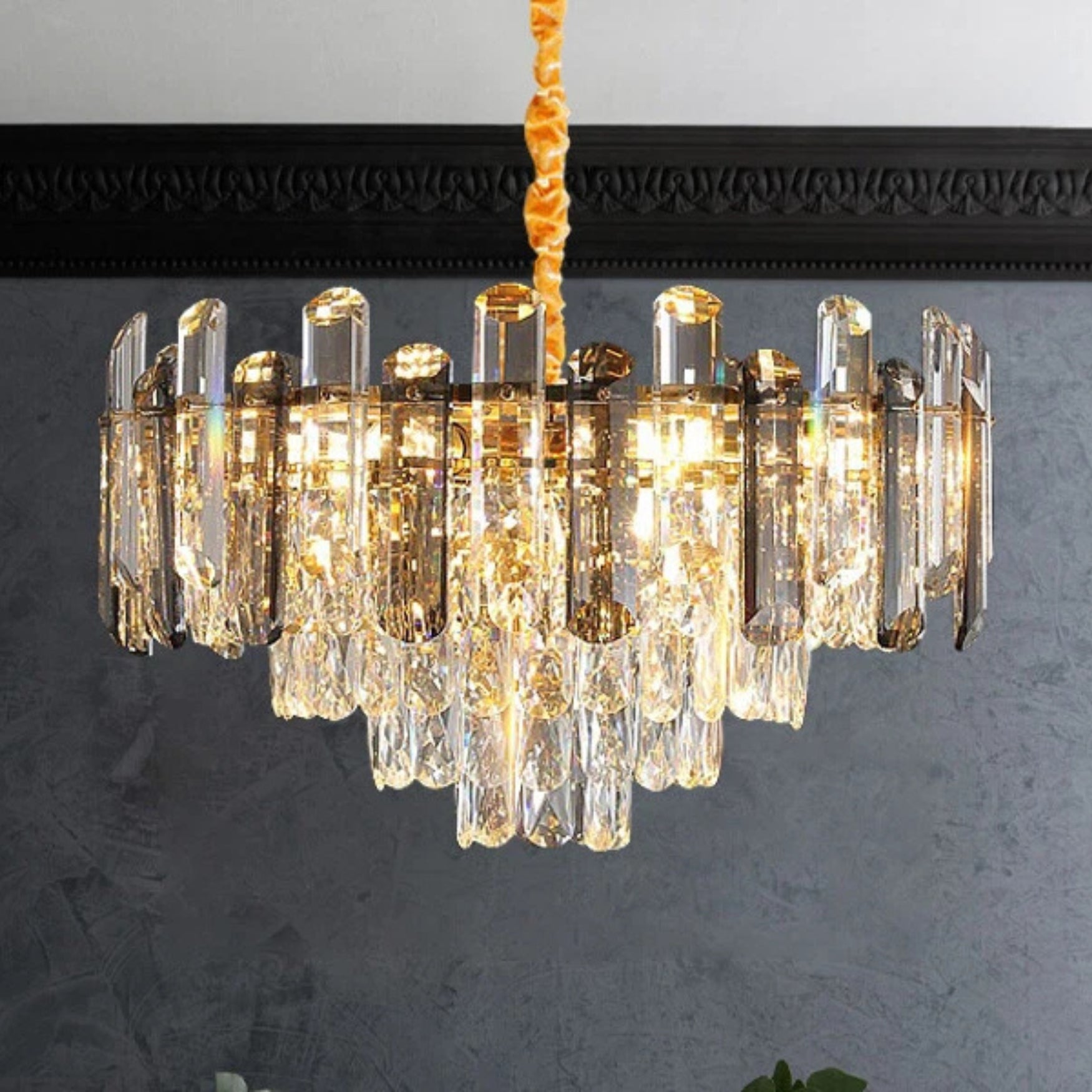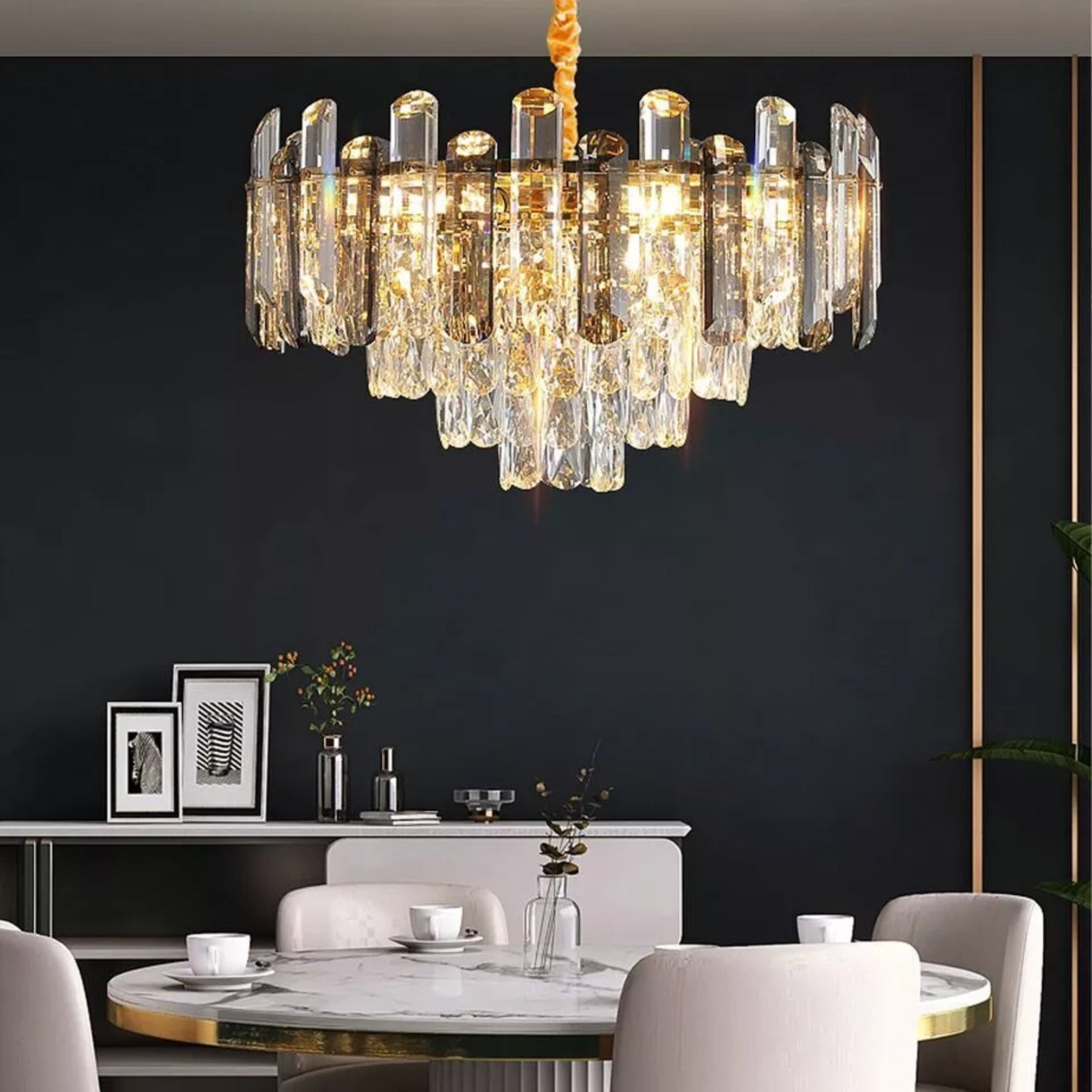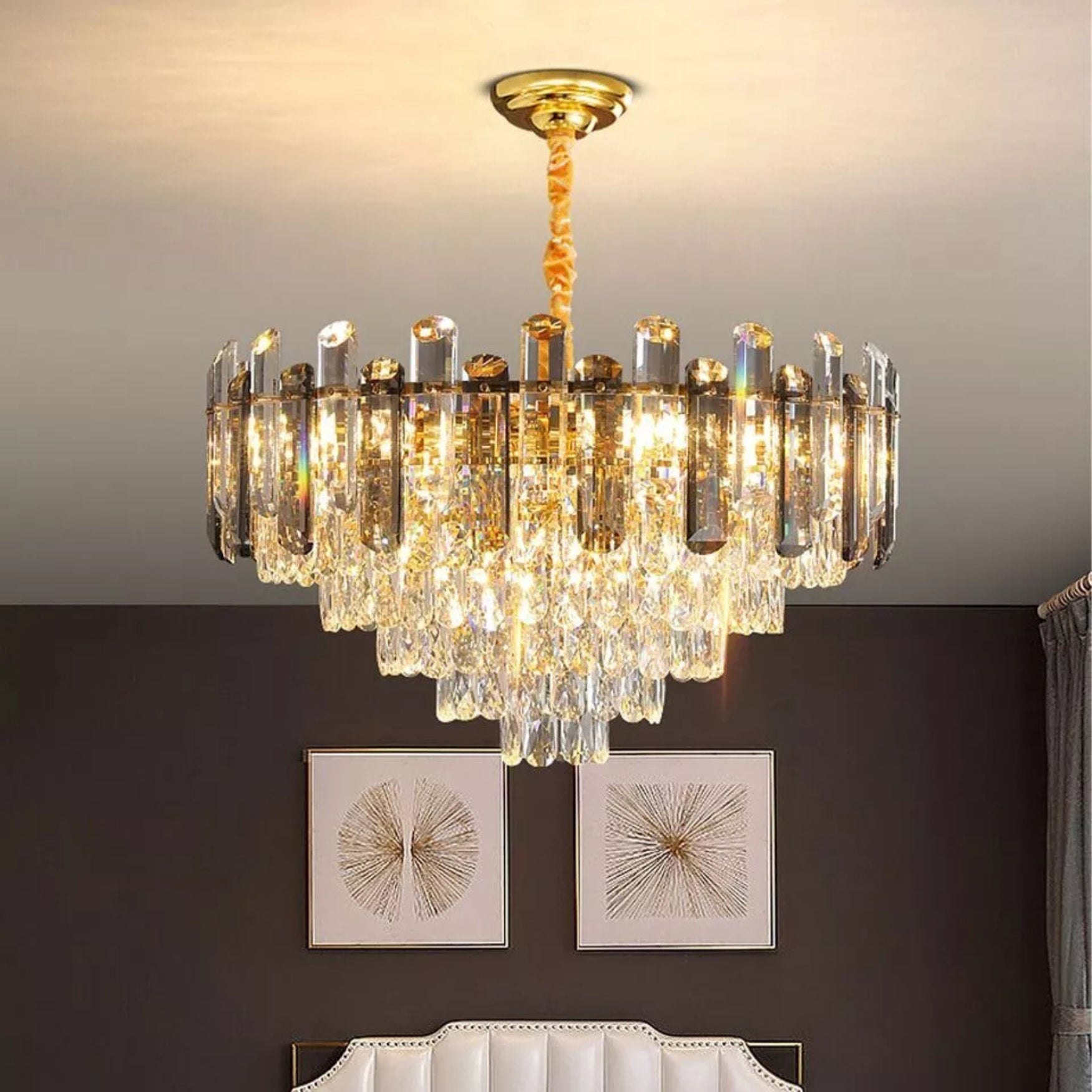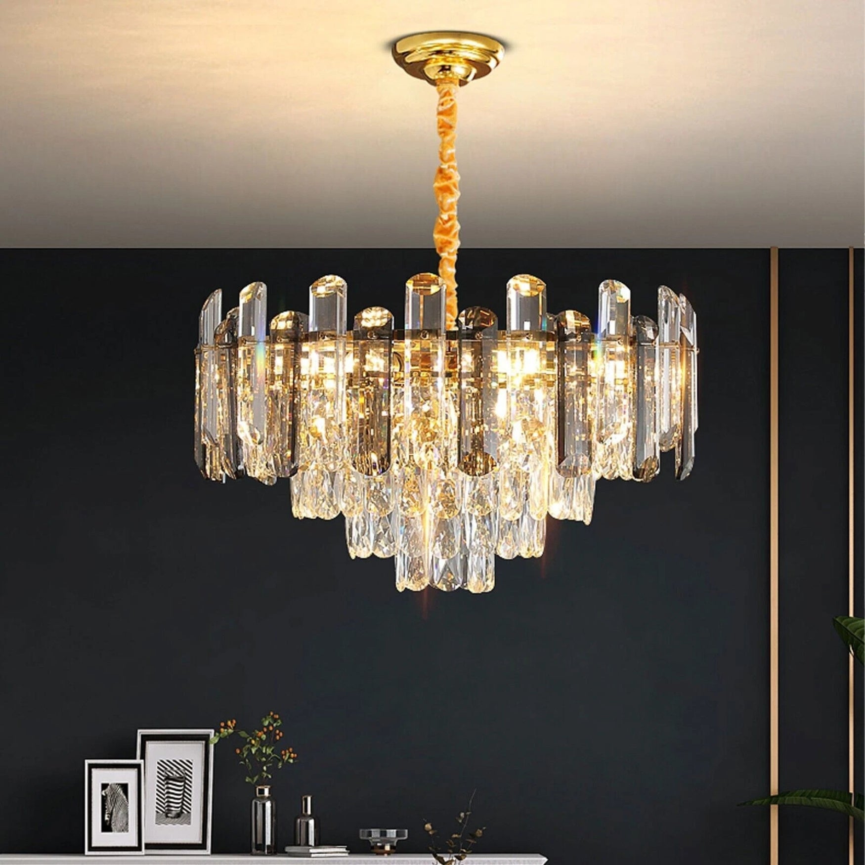 ✔️ Multi-tiered crystal structure – Layered crystal prisms refract light beautifully, creating a sparkling, luxurious atmosphere.