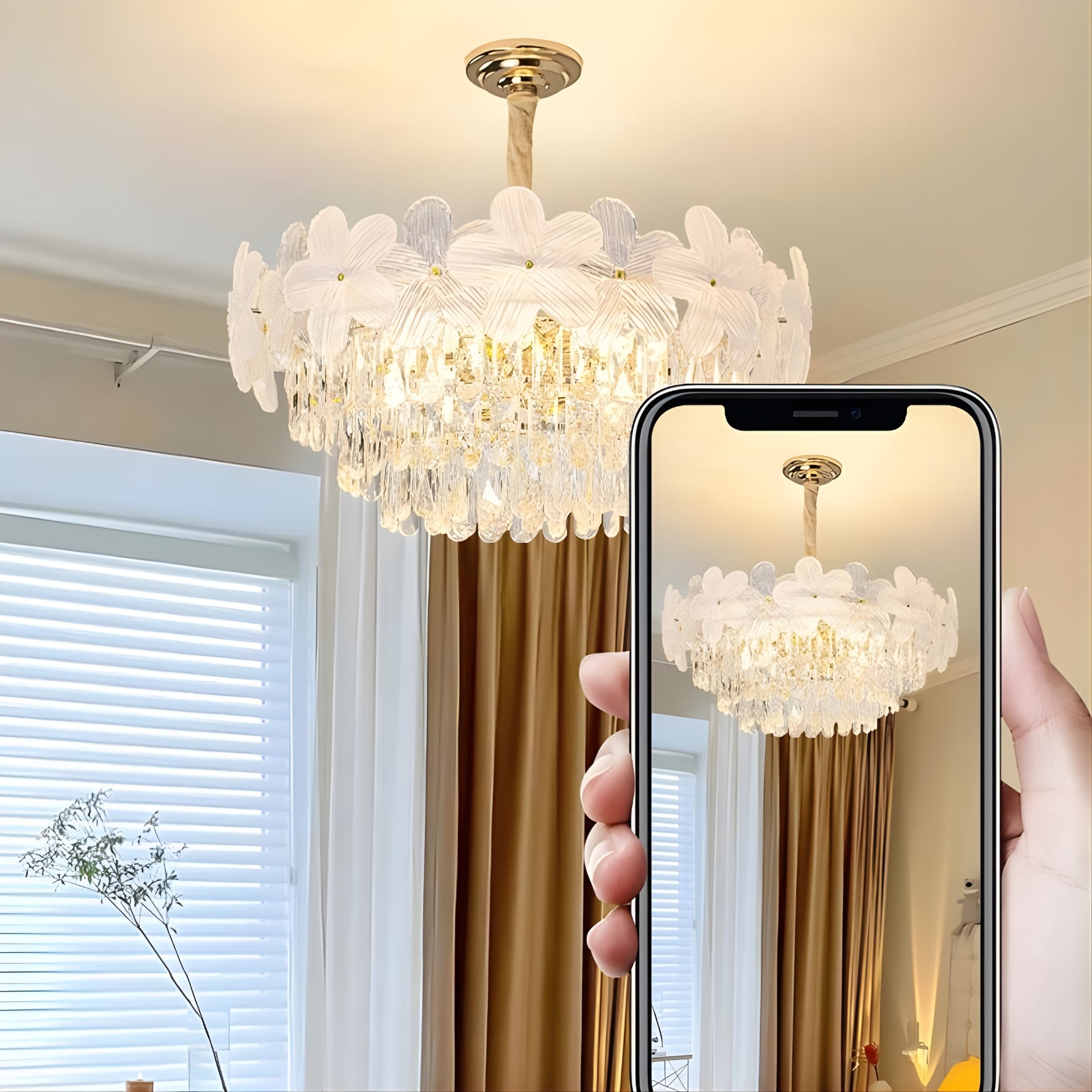 This breathtaking chandelier transforms any room into a sophisticated, warm, and inviting atmosphere. Designed with delicately sculpted floral crystal droplets and a gleaming gold frame, it casts a radiant glow that elevates modern, classic, and contemporary interiors.