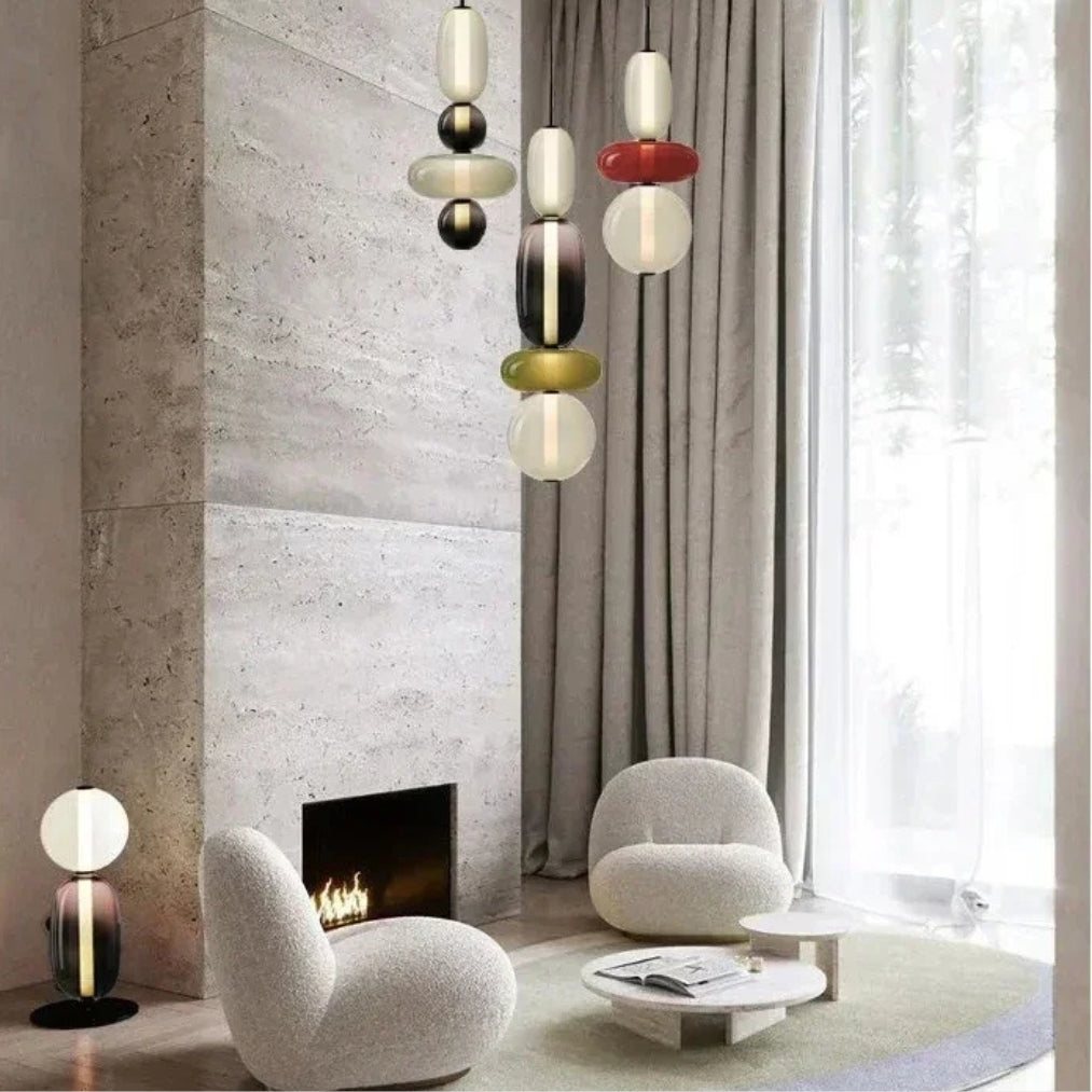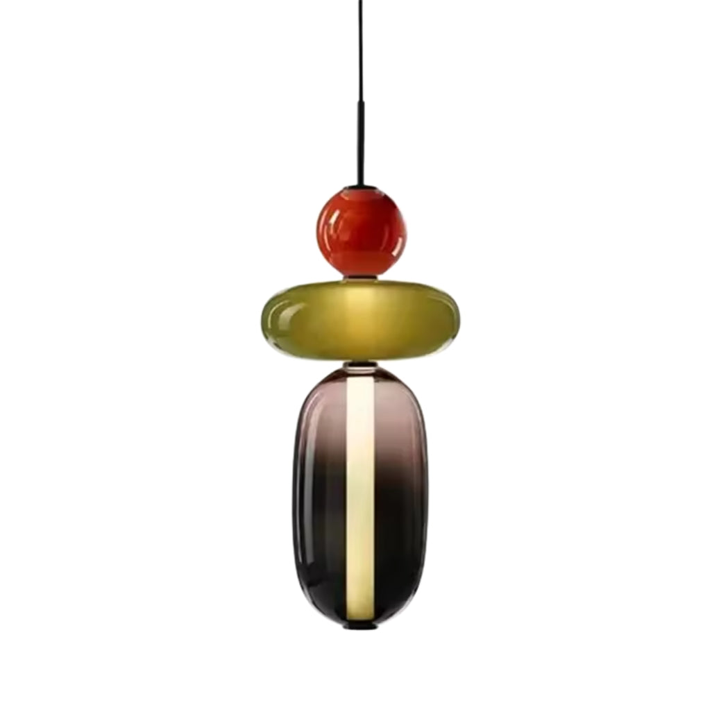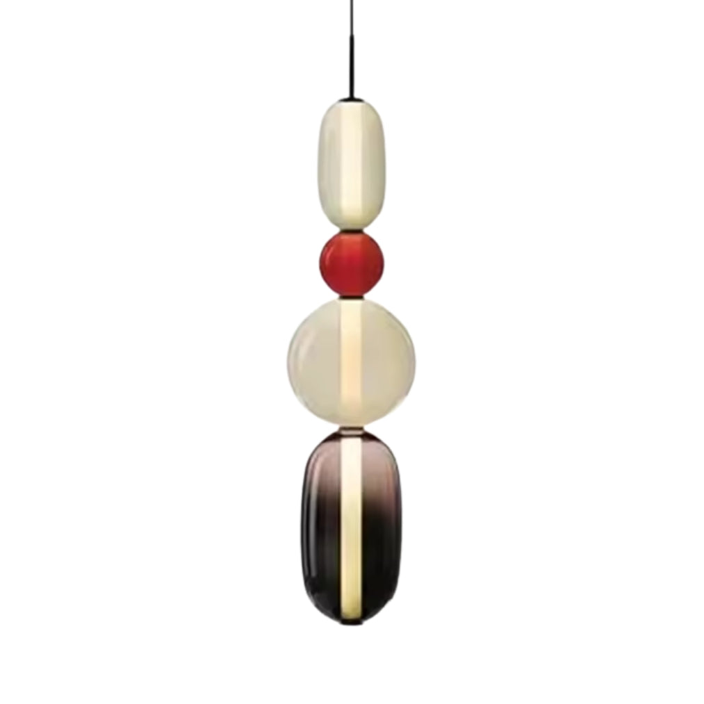 The LumiBead pendant light blends artistic design with functional elegance, making it a striking addition to any home. Featuring stacked colored glass elements in frosted white, amber green, bold red, and deep black, this pendant light creates a vibrant yet sophisticated statement piece.