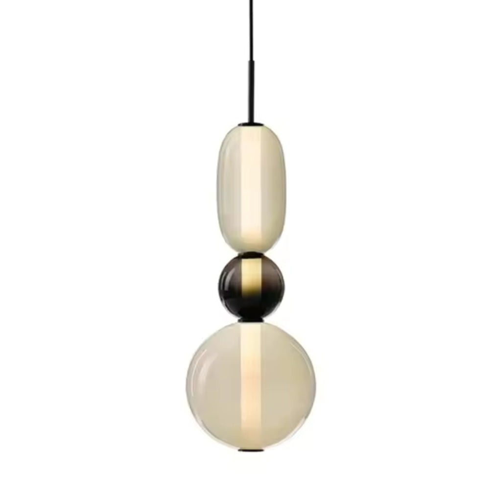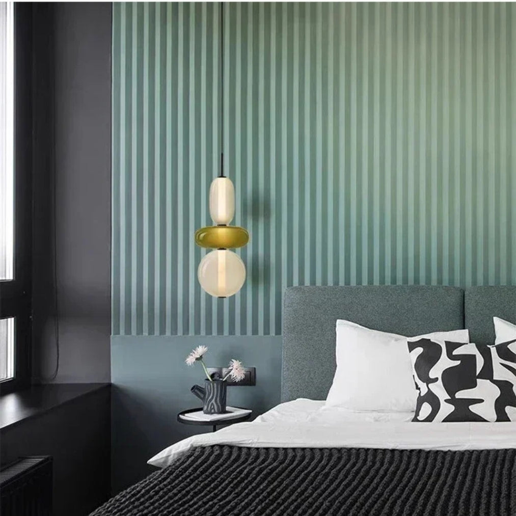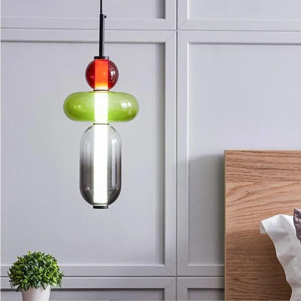 The LumiBead pendant light blends artistic design with functional elegance, making it a striking addition to any home. Featuring stacked colored glass elements in frosted white, amber green, bold red, and deep black, this pendant light creates a vibrant yet sophisticated statement piece.