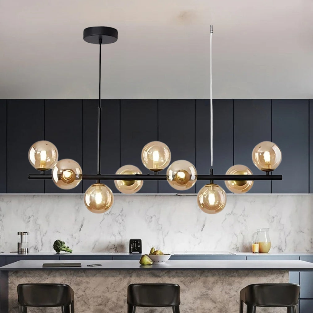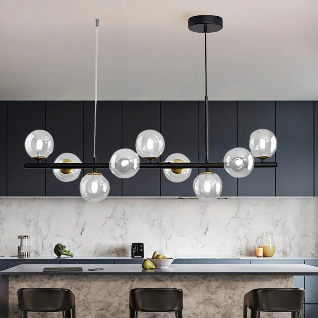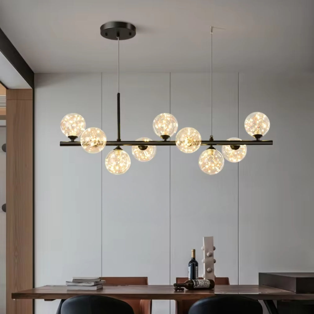 The LumiGlobe chandelier transforms everyday lighting into a stunning design statement. Featuring a sleek black frame accented with radiant glass globes, this chandelier captures the essence of modern sophistication.