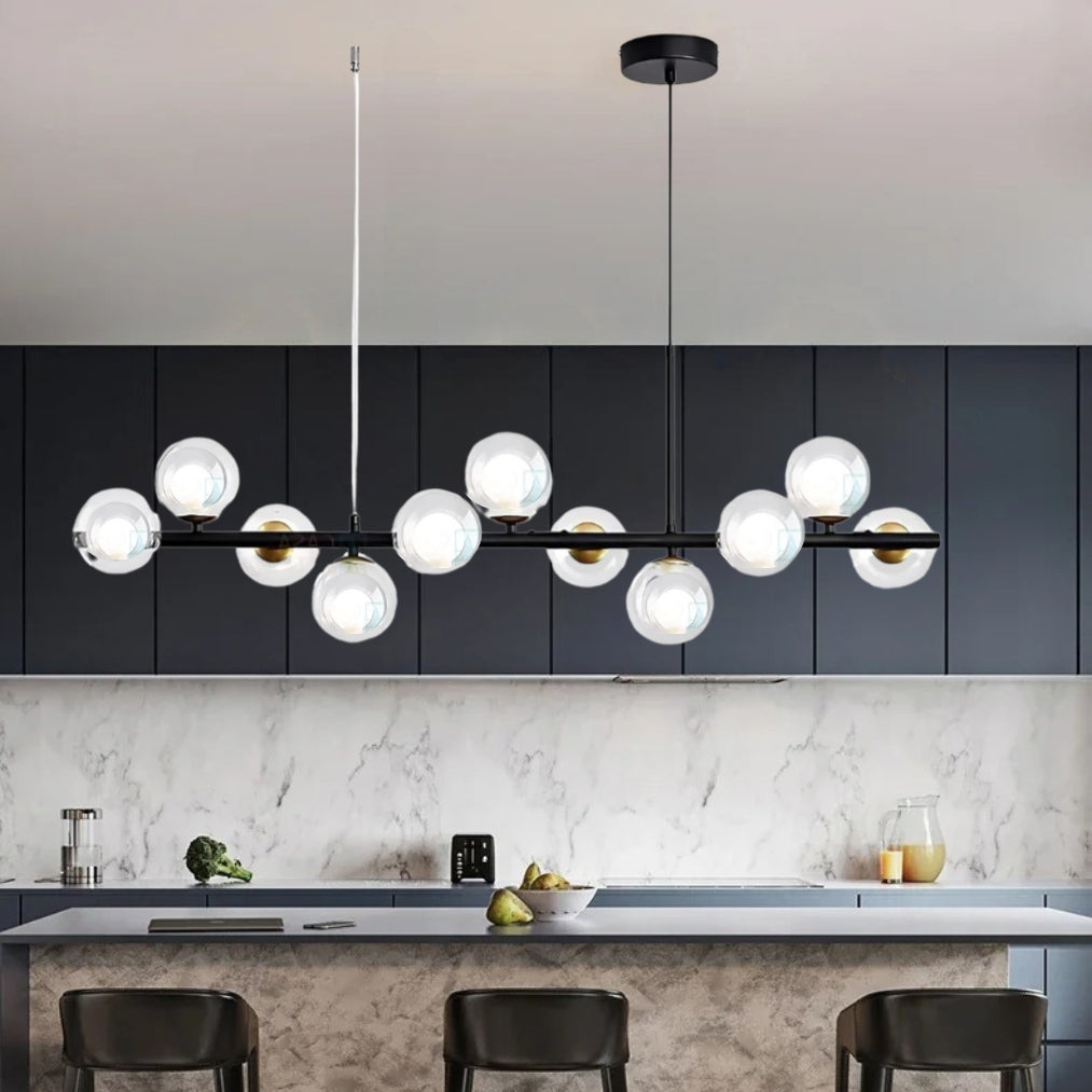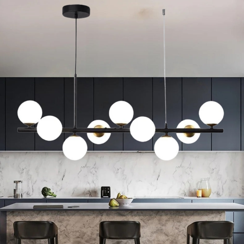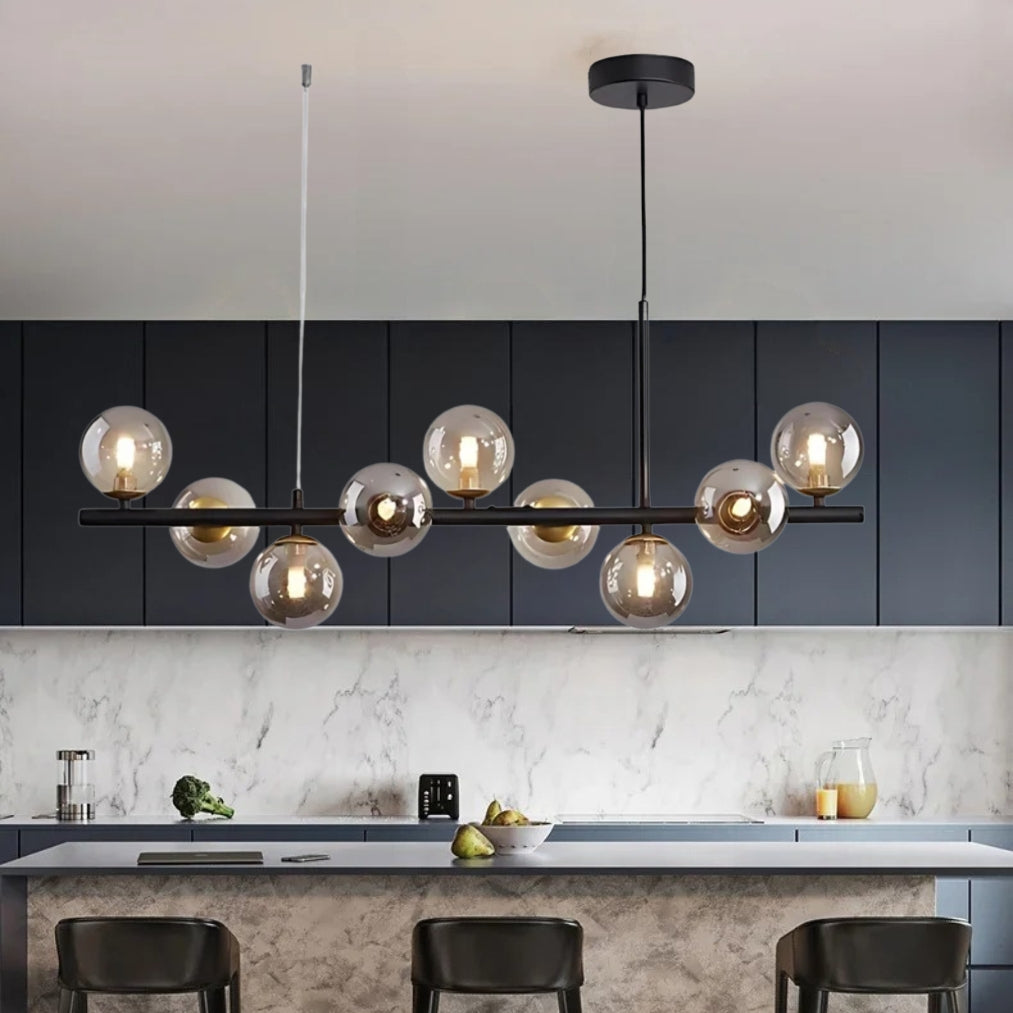 The LumiGlobe chandelier transforms everyday lighting into a stunning design statement. Featuring a sleek black frame accented with radiant glass globes, this chandelier captures the essence of modern sophistication.
