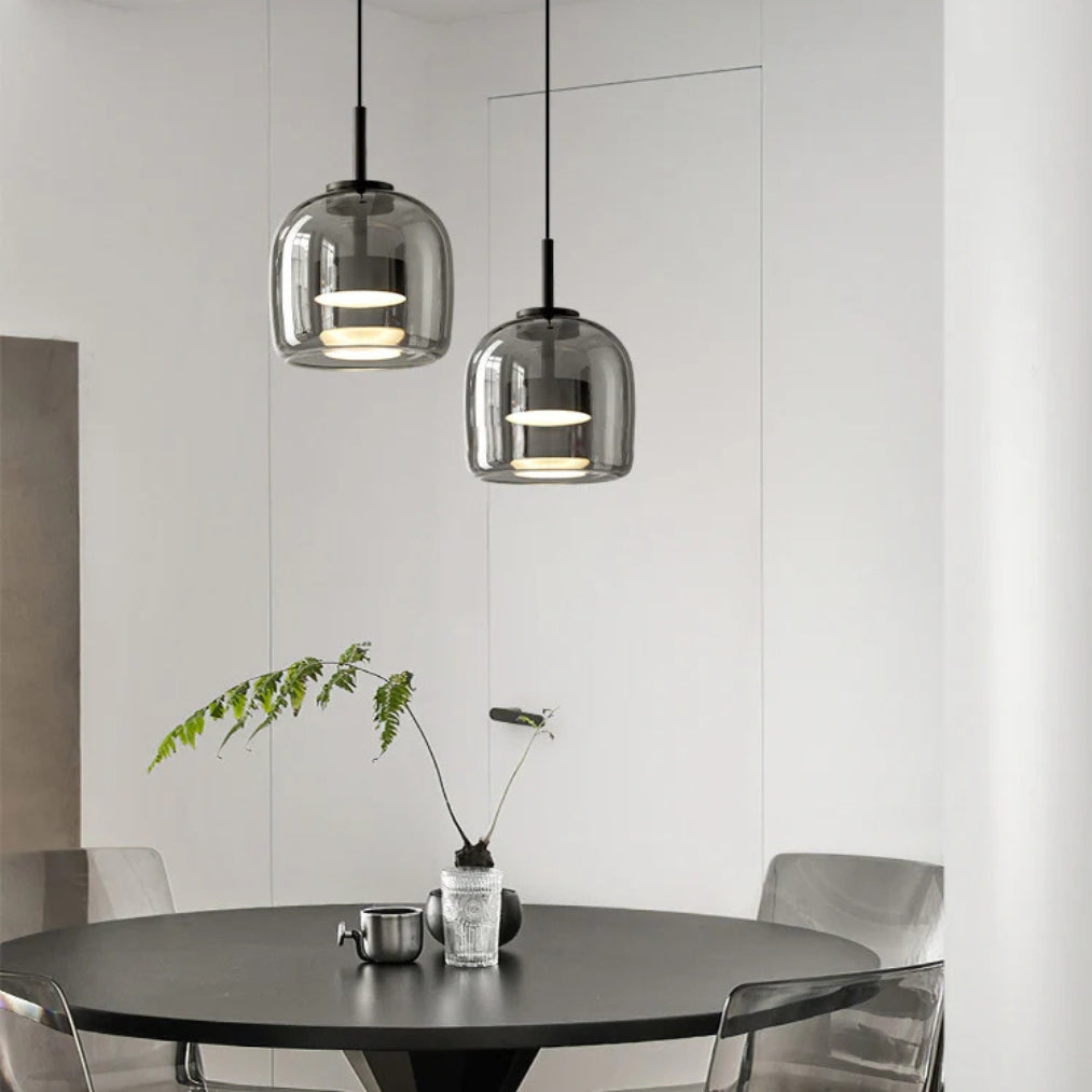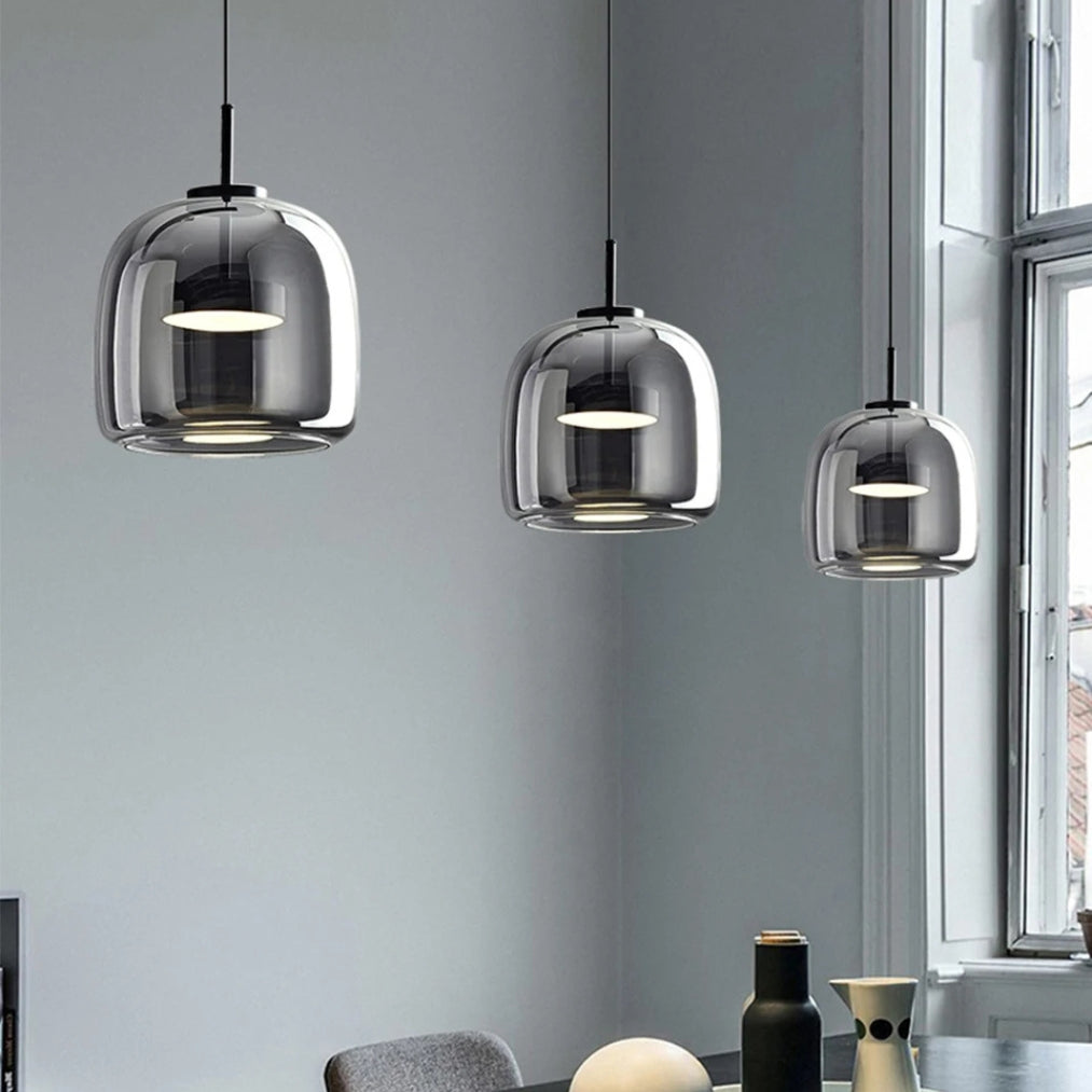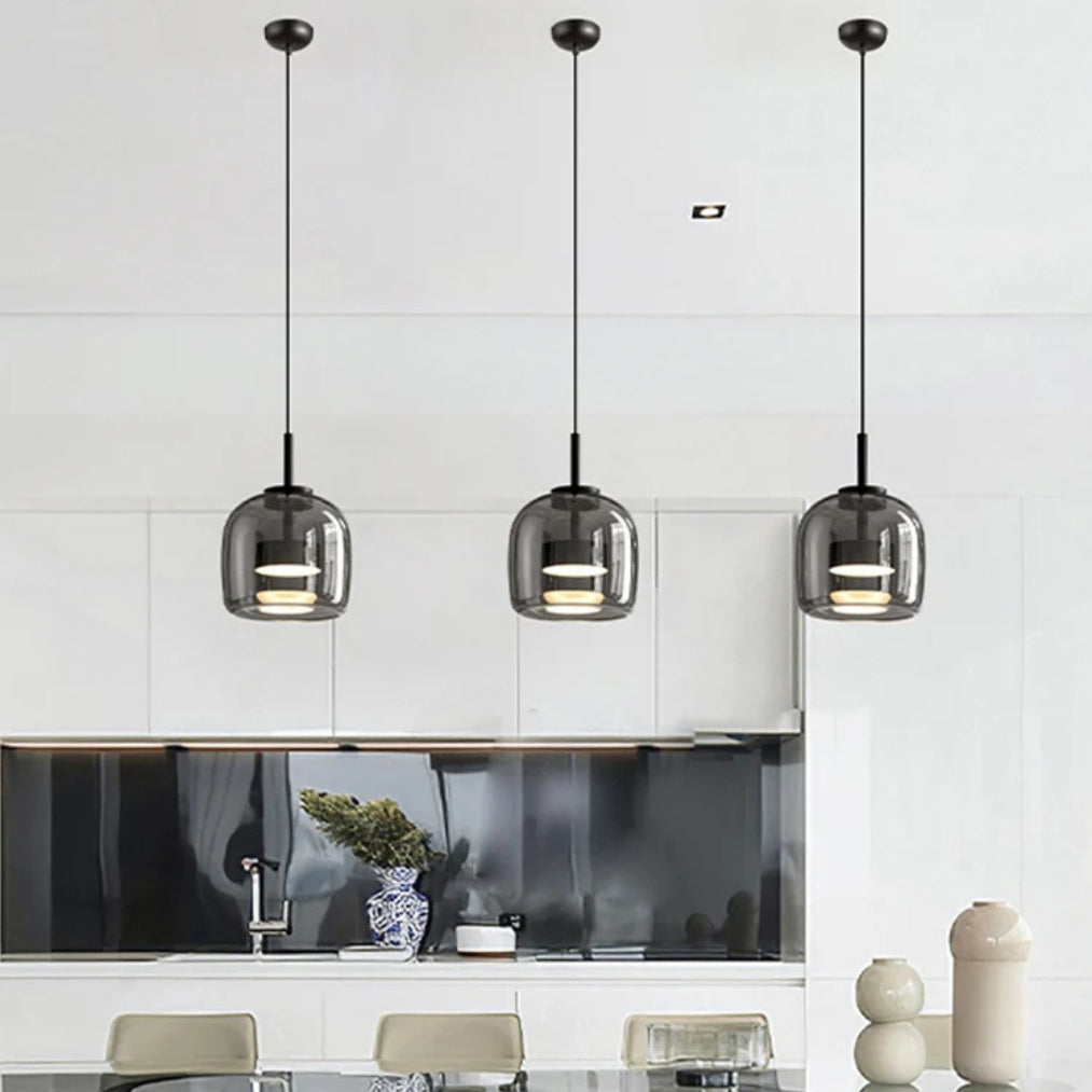 The smoked glass shades paired with sleek black accents add depth and character, making it an eye-catching statement piece for kitchens, dining rooms, or living spaces. Whether installed as a single light or in a cluster, it delivers both aesthetic appeal and practical illumination.