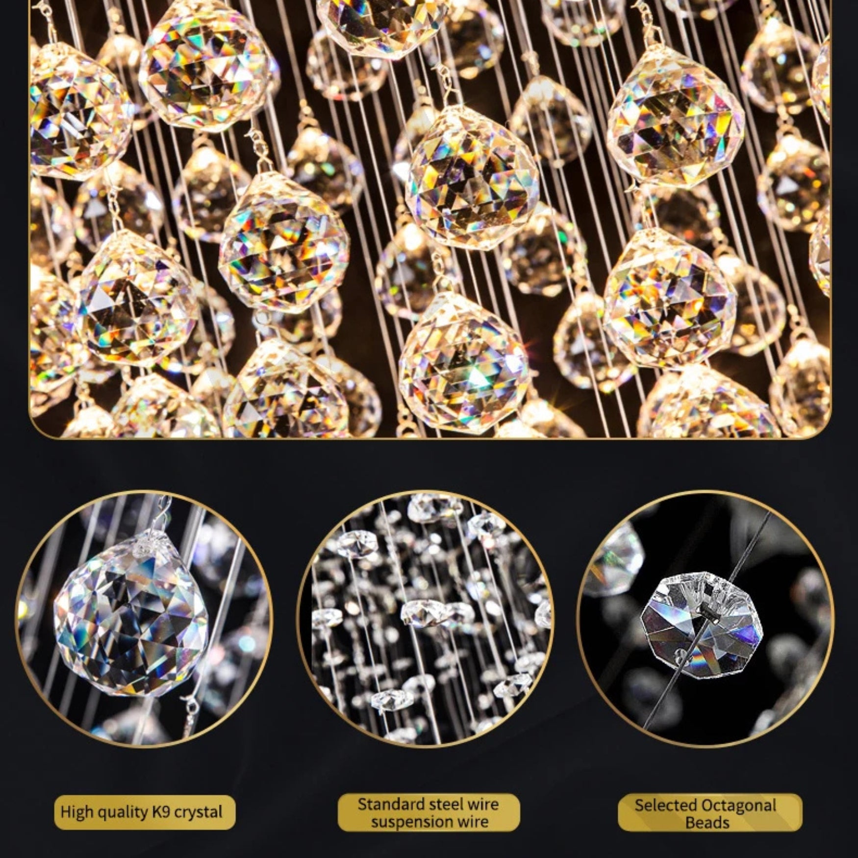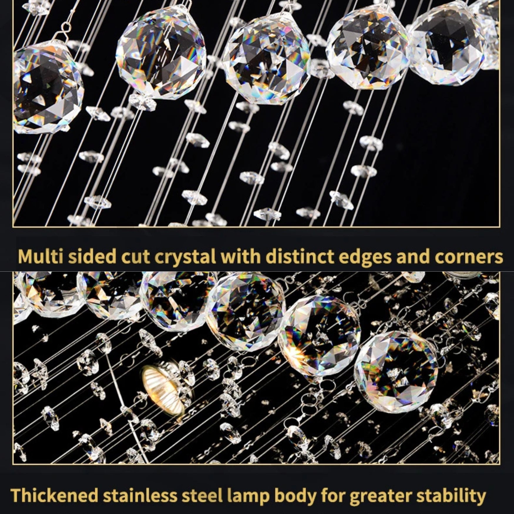 ✔️ Captivating spiral crystal structure – A dramatic spiral of crystal spheres descends gracefully, creating a stunning kinetic visual effect perfect for staircases and tall rooms.