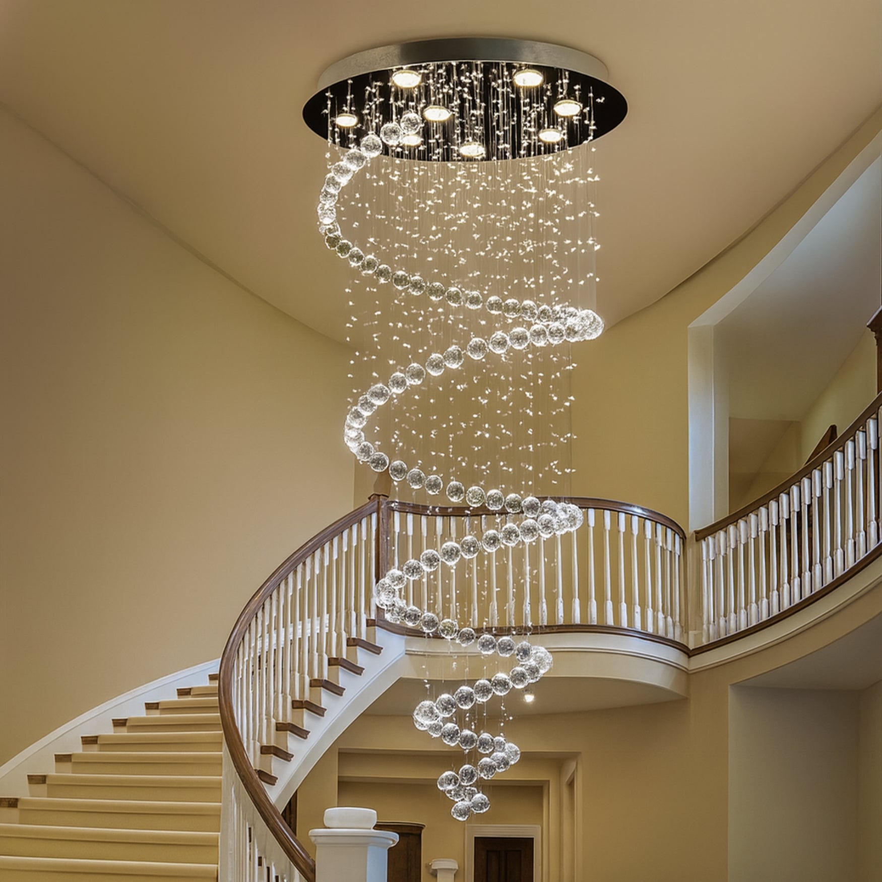 The SpiralAurora Hanging Crystal Staircase Chandelier is crafted to transform grand interiors into breathtaking, luxurious spaces. With its cascading spiral of shimmering crystal spheres and powerful ceiling-mounted light plate, this chandelier creates an unforgettable visual impact the moment you walk in.
