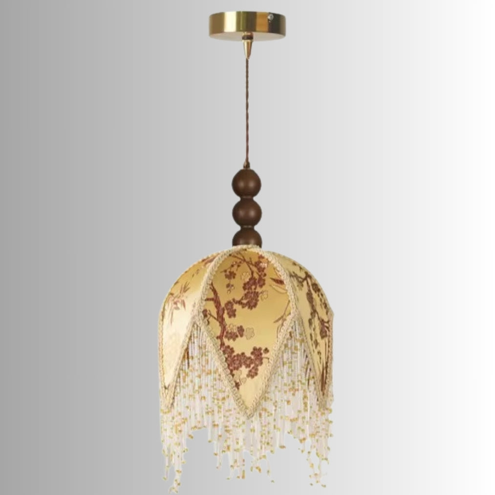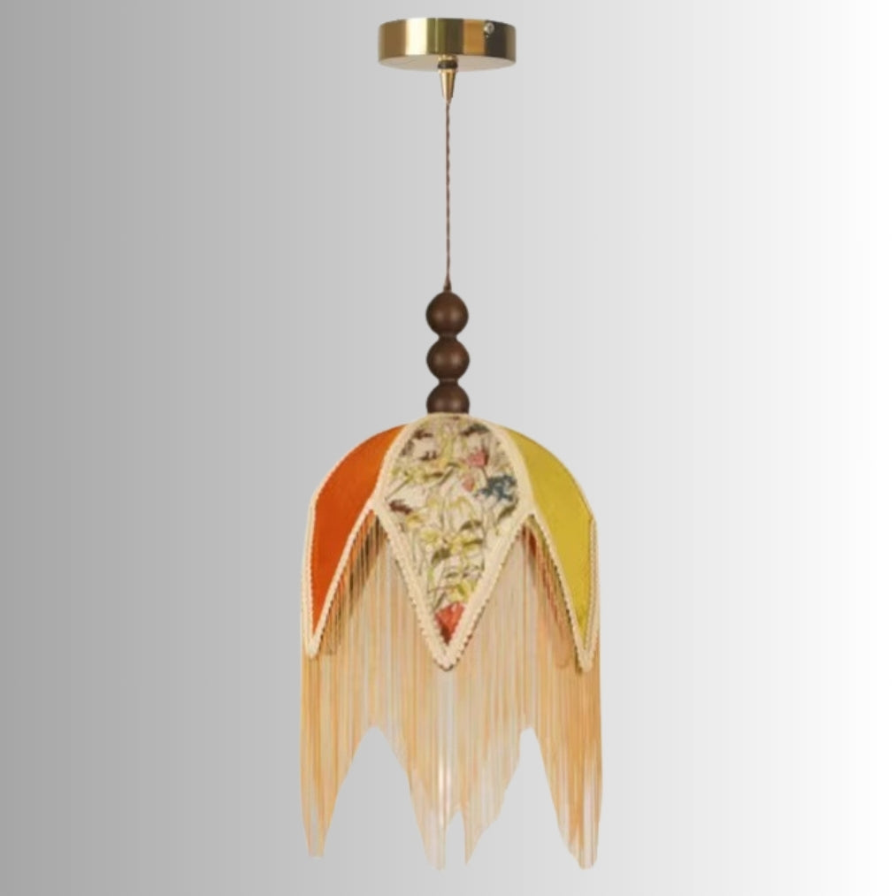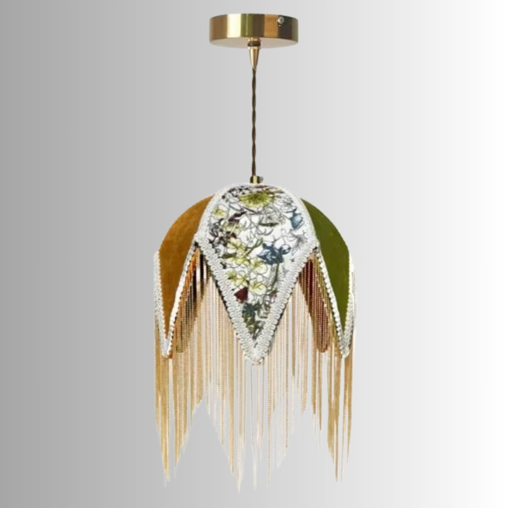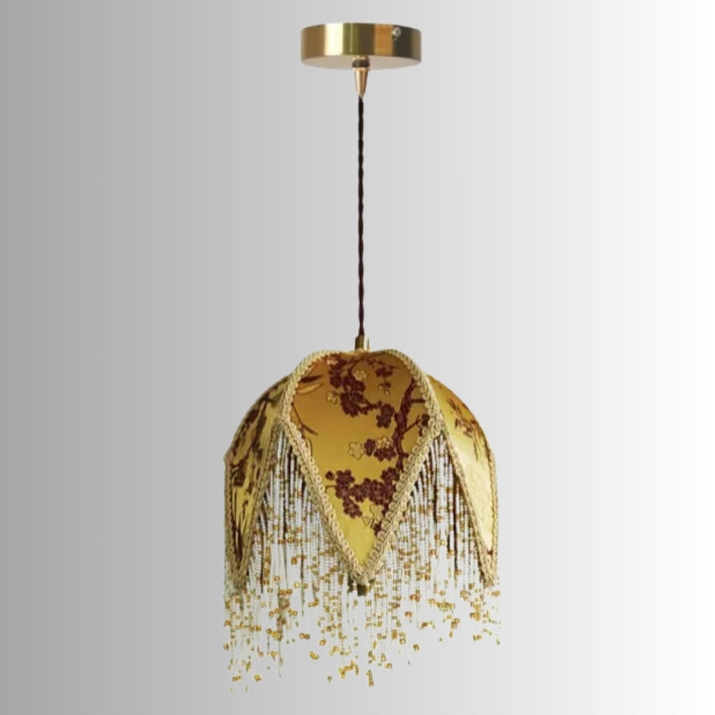 Bring timeless charm into your home with the TissuLoom – a vintage hanging pendant light that captures the elegance of a bygone era. Crafted with rich fabric, delicate floral accents, and cascading gold fringes.