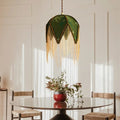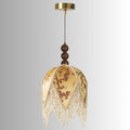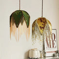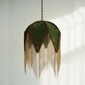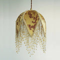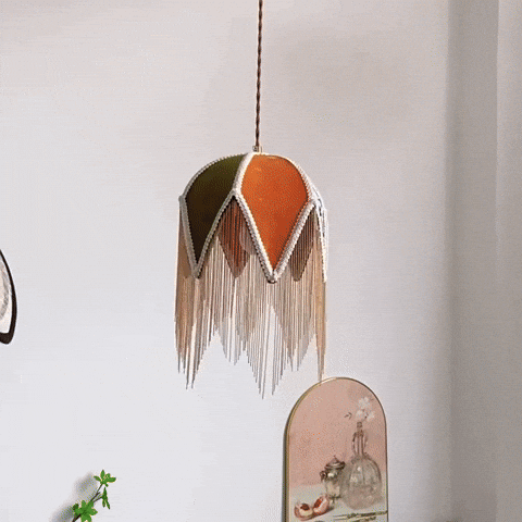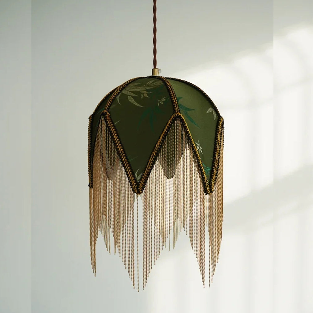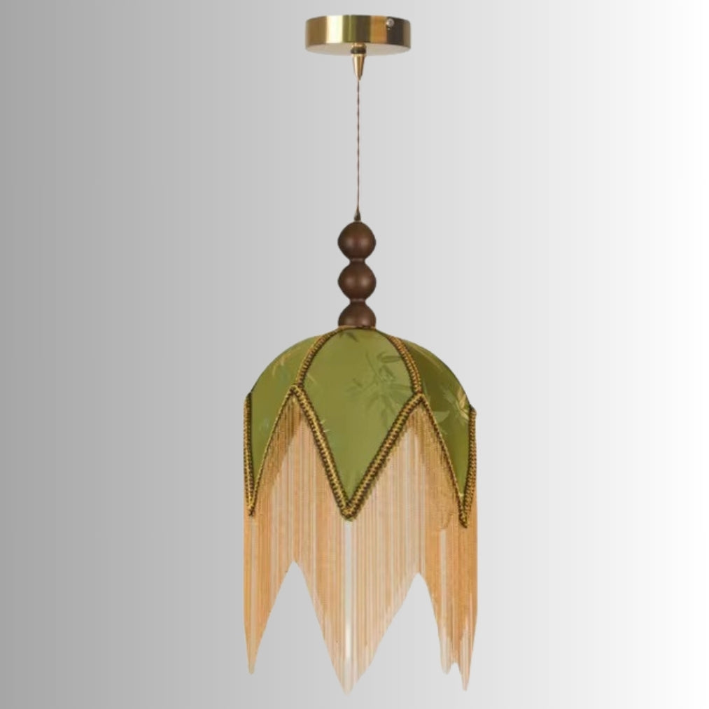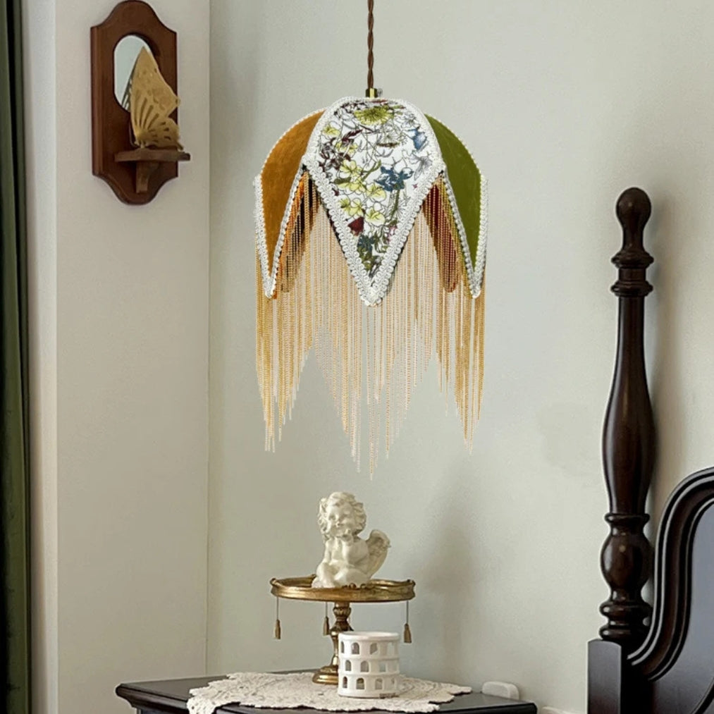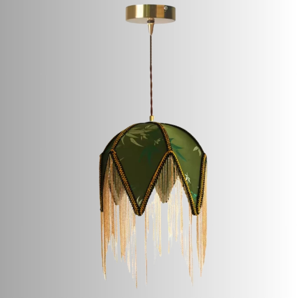 Bring timeless charm into your home with the TissuLoom – a vintage hanging pendant light that captures the elegance of a bygone era. Crafted with rich fabric, delicate floral accents, and cascading gold fringes.